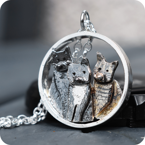 As I polished the finished piece, I found myself thinking about how many evenings these three cats must have spent curled up together, how many purrs, paws, and whiskers had filled David and his wife’s home. To know that I could capture them, side by side, in a necklace that will last forever… that felt very special.
