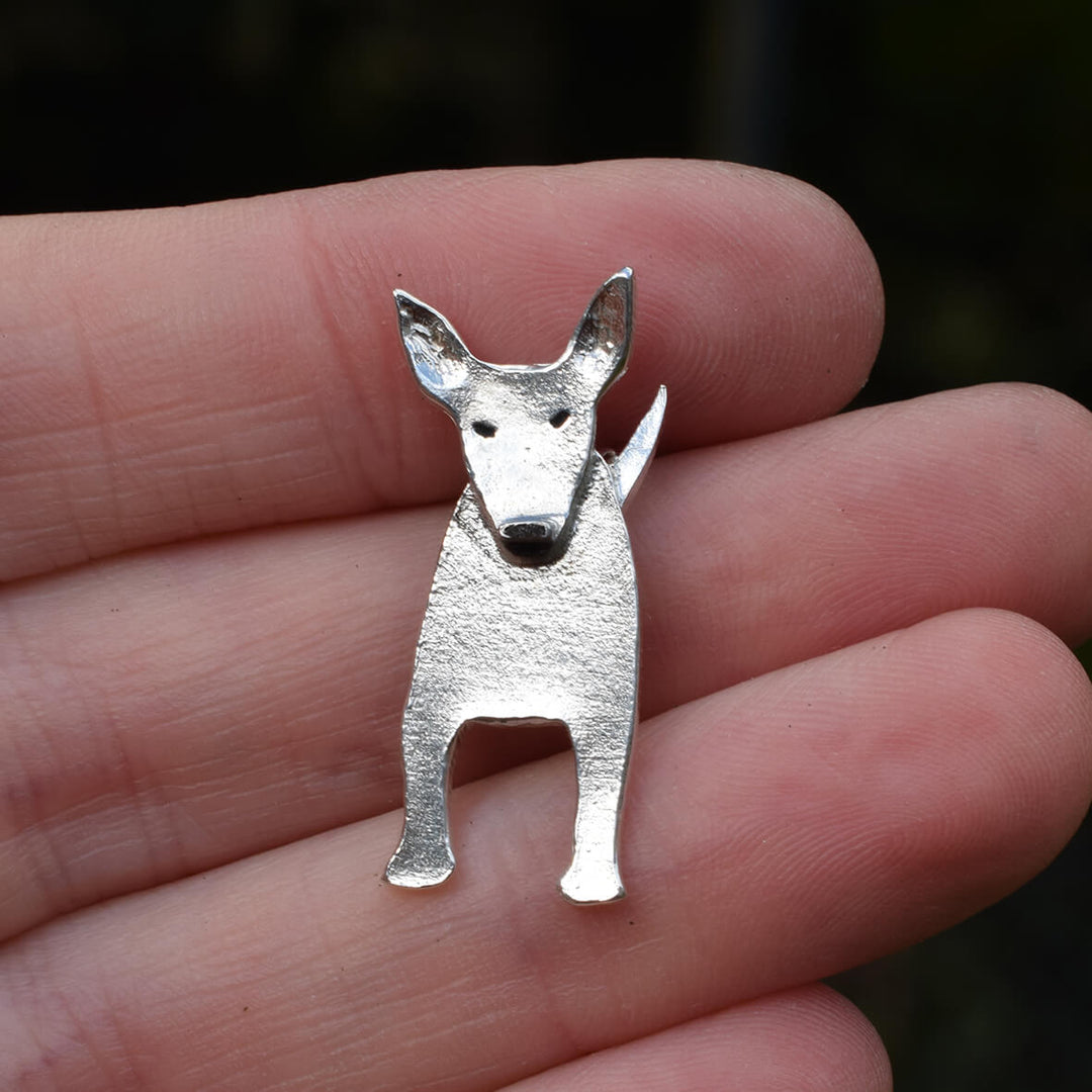 A handcrafted silver brooch featuring a striking English Bull Terrier dog.  The pendant comes with a silver ring attached to a silver safety fastening so the dog doesn't wander!