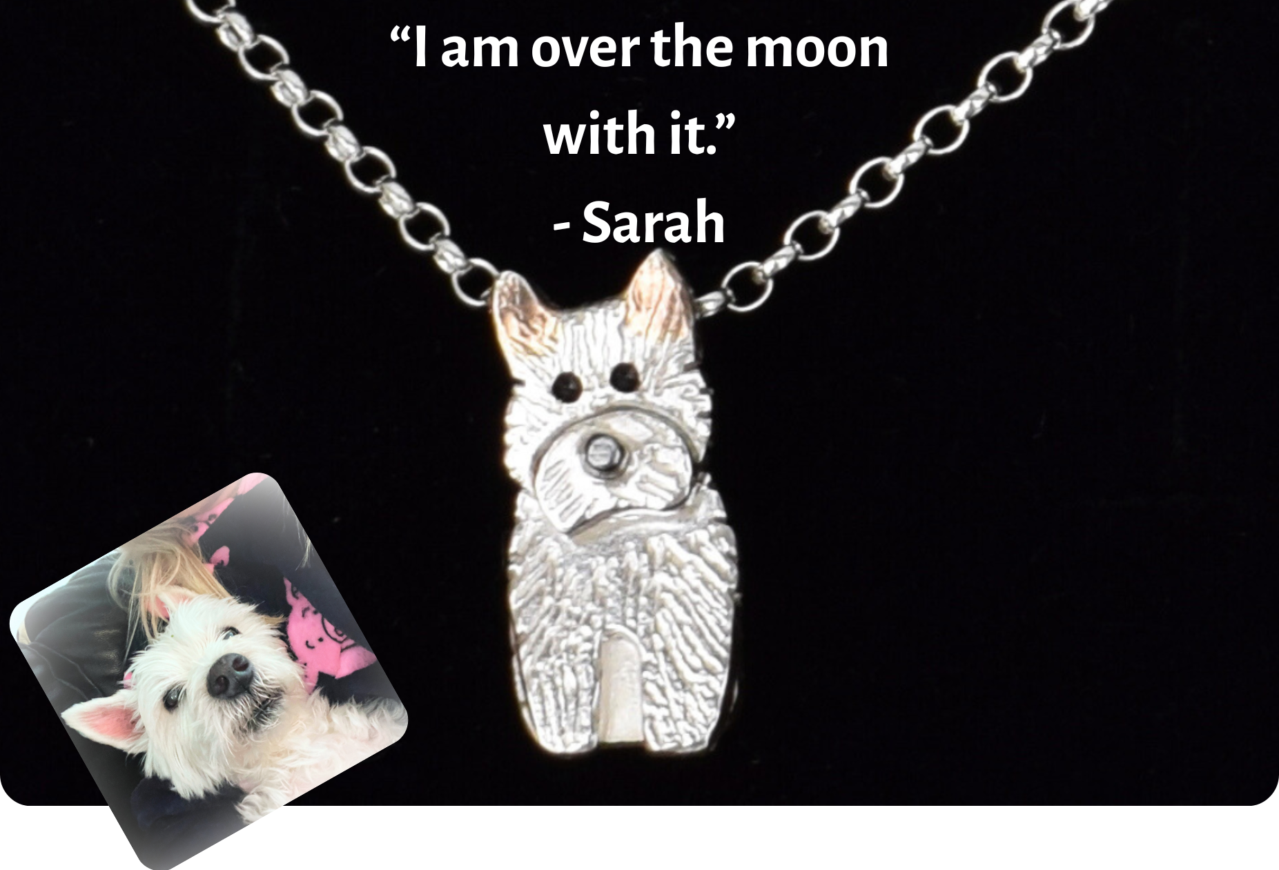 “Have just received my beautiful Barney necklace and am over the moon with it. Our little man passed away on May 3rd so it’s amazing to have this to always keep him close. Thank you so very much. Sarah xxx”
