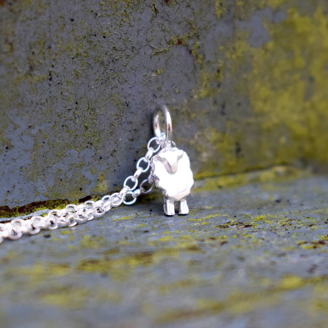 A handcrafted silver necklace with a cute wee sheep.  The pendant comes with a silver ring attached to a 16", 18", 20", 22" or 24" heavyweight sterling silver belcher chain.